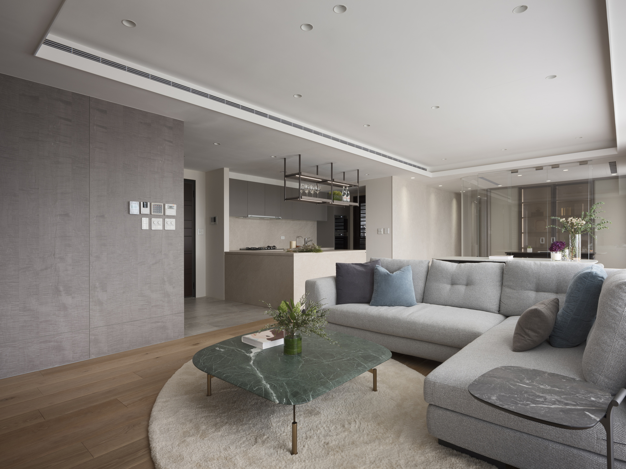 周總監說,「我們會刻意拉出一個材質成為焦點主角,並從玄關開始,使紋路是順流到客廳,呈現流動的動態視覺平衡,且可以解讀為一種設計手法,而這樣的做法自然會把空間串連在一起,且覺得這個空間不會被切割,只要一拿出我們的作品,便會很明顯感受到這是京璽國際的氛圍。」