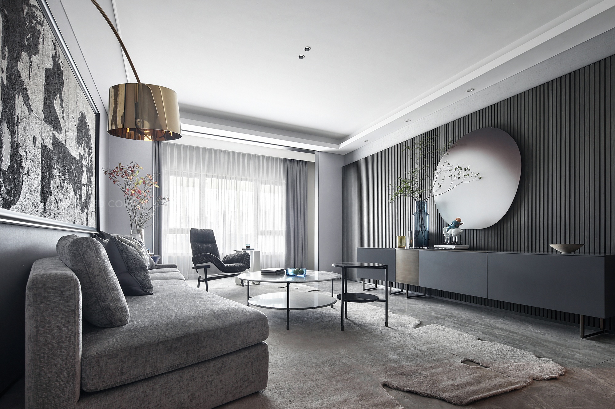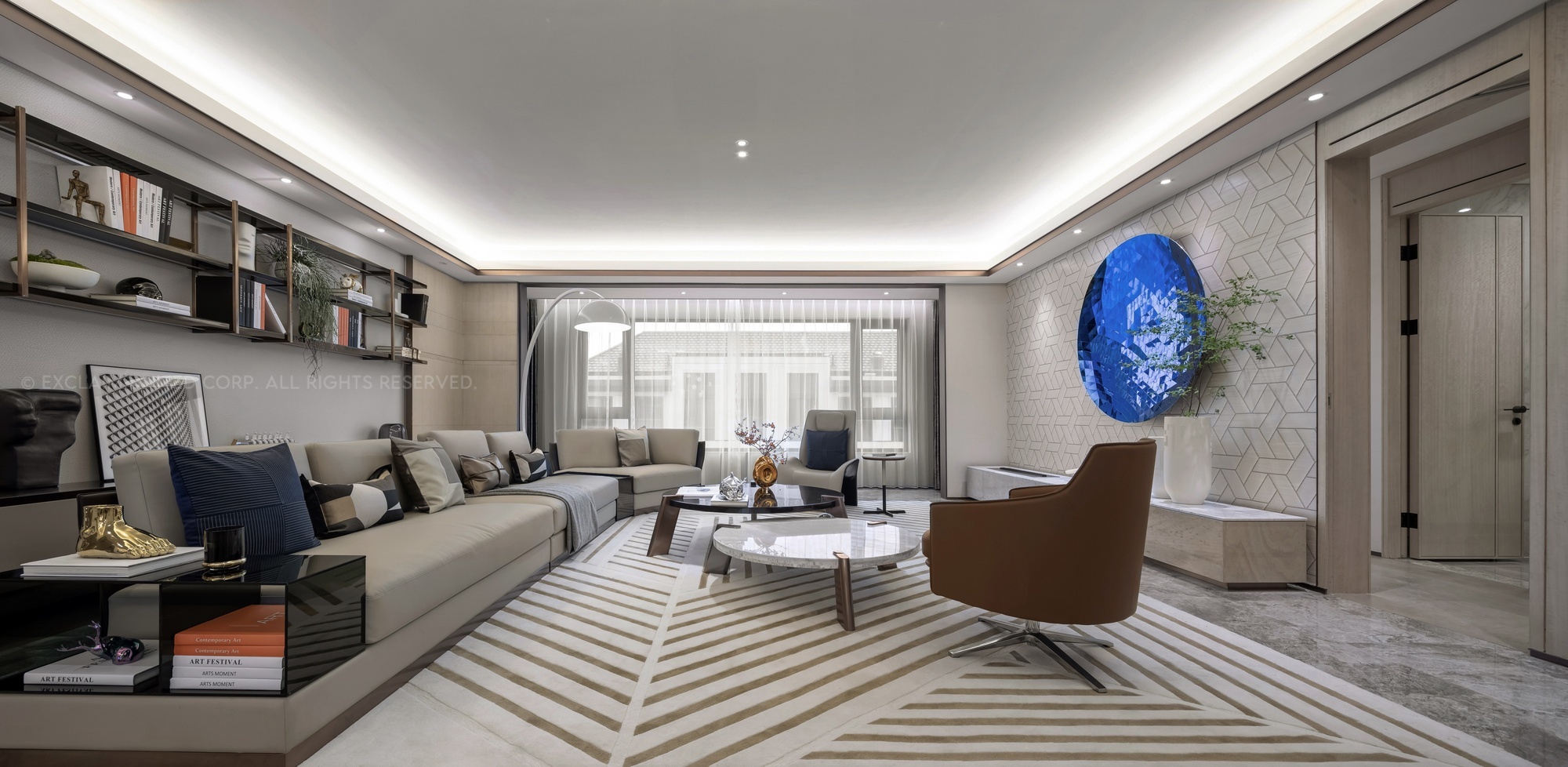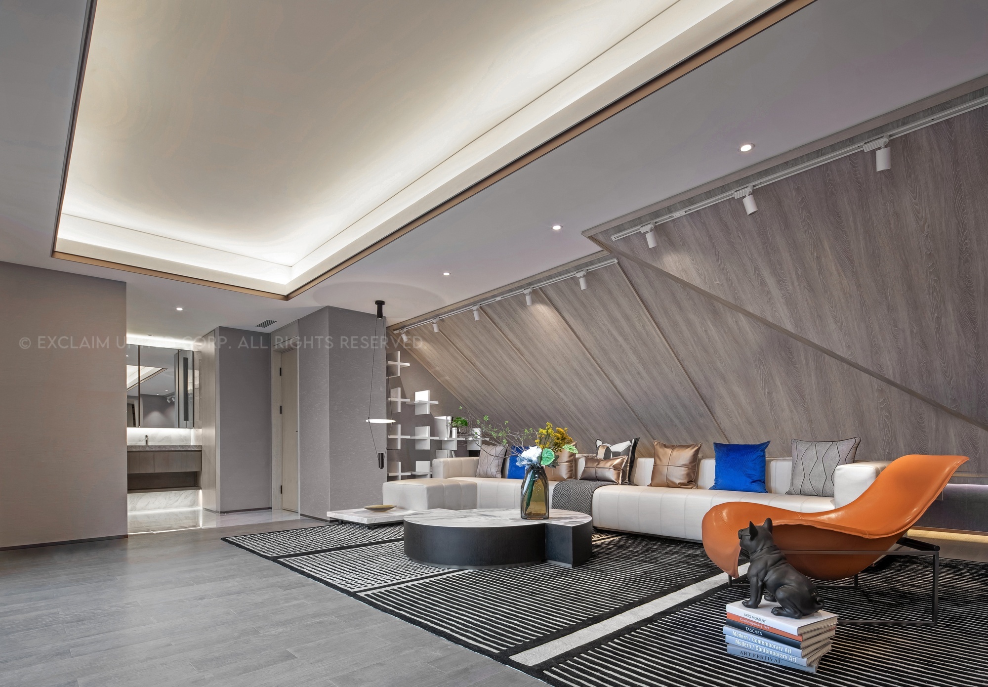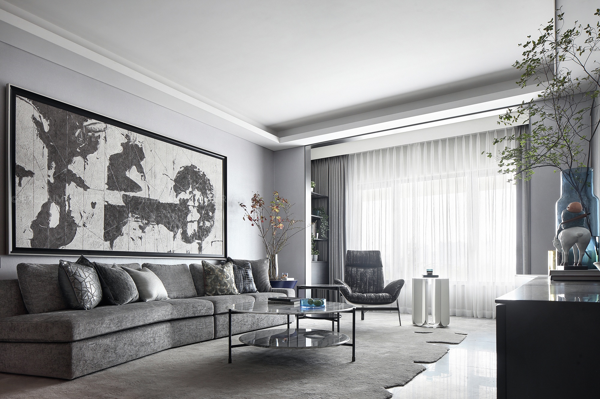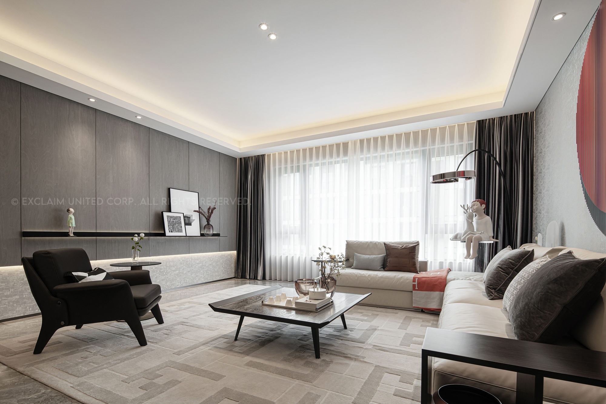 而位於大陸西安的作品《凌躍‧感性奢華 Sensual luxury》,是一間複層閣樓的空間,以中性色調,加上適當留白與極少的裝飾,展演雅緻、細膩的浪漫主義,另一作品《藝術・隨形 Shaping of Art》,則是帶入中式的潑墨的山水意象,利用灰階色彩的烤漆及硬軟裝,搭配同色系的藝術品,呈現空間的表情及感受。