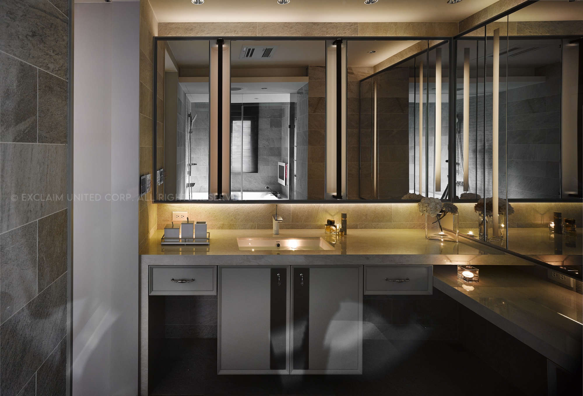 浴室不再只是洗澡的空間,梳妝打扮、蒸氣放鬆,都可以在這裡一起完成,因此,機能要好,造型要美,即使長時間流連,也能舒適悠閒的偷得浮生半日。周總監特別設計L型的高低交叉檯面,洗淨、梳化一次完成,空間中更配置了兩部蒸氣設備,以及可以存放面膜保養品的小冰箱,讓屋主在家就能體驗比飯店更頂級的洗浴享受。牆面以相同大理石材質,不同的尺寸拼貼或加工成小馬賽克磚,既有設計完整性又有不同的視覺感受。