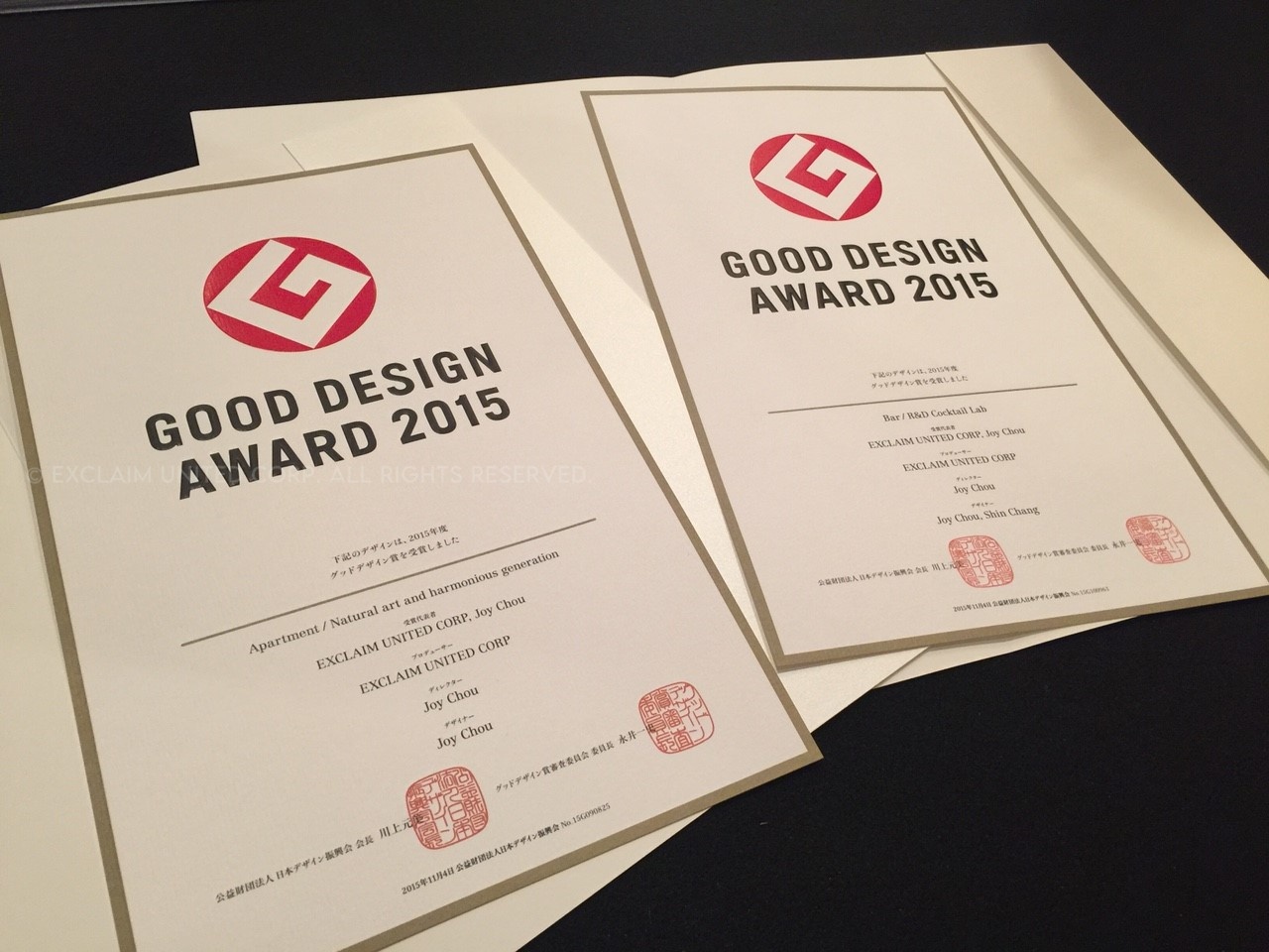 經過4月到11月漫長的日子,在昨天去到東京日本GOOD DESIGN AWARD獎展獲獎! 榮幸獲得「2015優良設計獎 」:《國泰一品.城隅綠居》與《R&D Cocktail Lab》 我們會持續努力!帶領京璽國際持續往前~ 明年還要請大家多多指教!