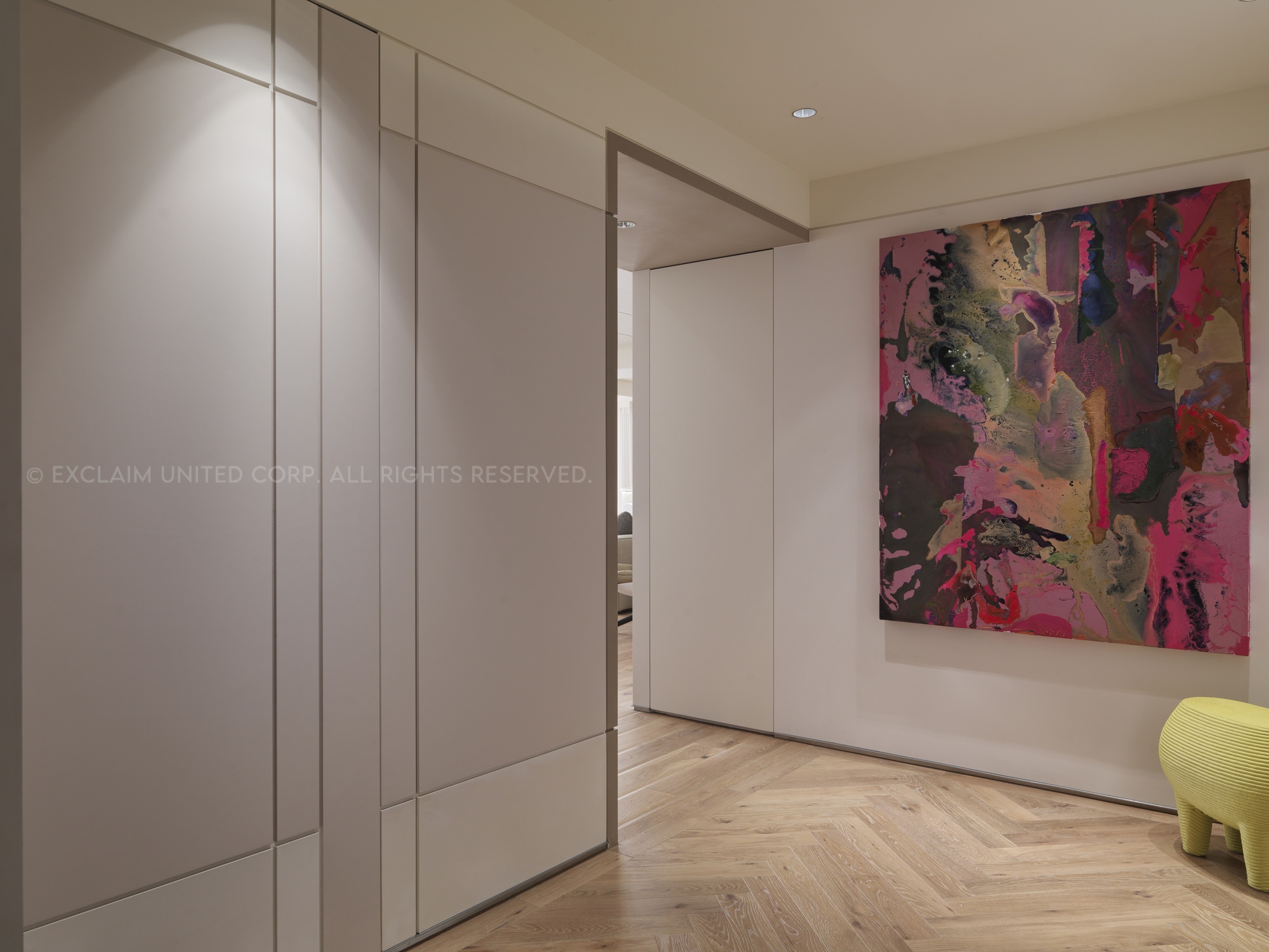 樑體結構型塑立體效果,在現代幾何線條的陣列下,分割動線開口,廊道植入藝廊概念,展示機能遍佈於動線裡,與居者交集相遇,賦予遐想空間的趣味。