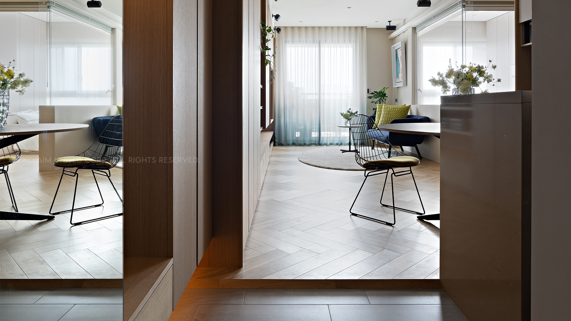 以清透材質、開放尺度,消弭邊界界限,讓一切交會無阻;設計師謹慎節制色彩,用天然實木拼接人字型地板溫潤紋理,扣合人文主題,在細節中讓人感受內心的安寧與舒暢,勾摹多層次關係,熨貼其中的是設計者精心琢磨的詩意解構。