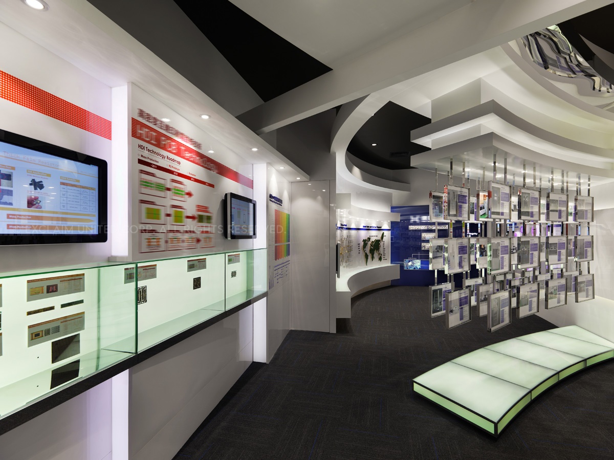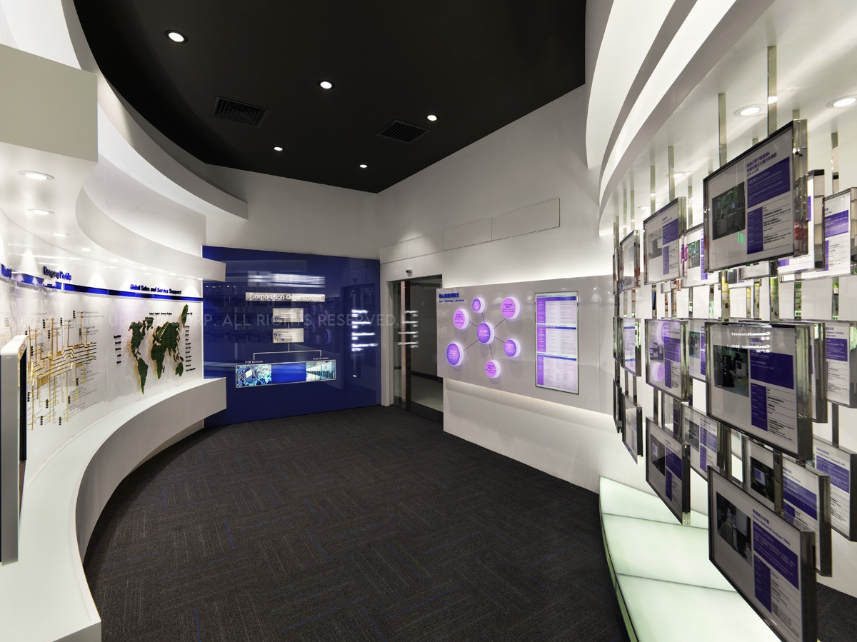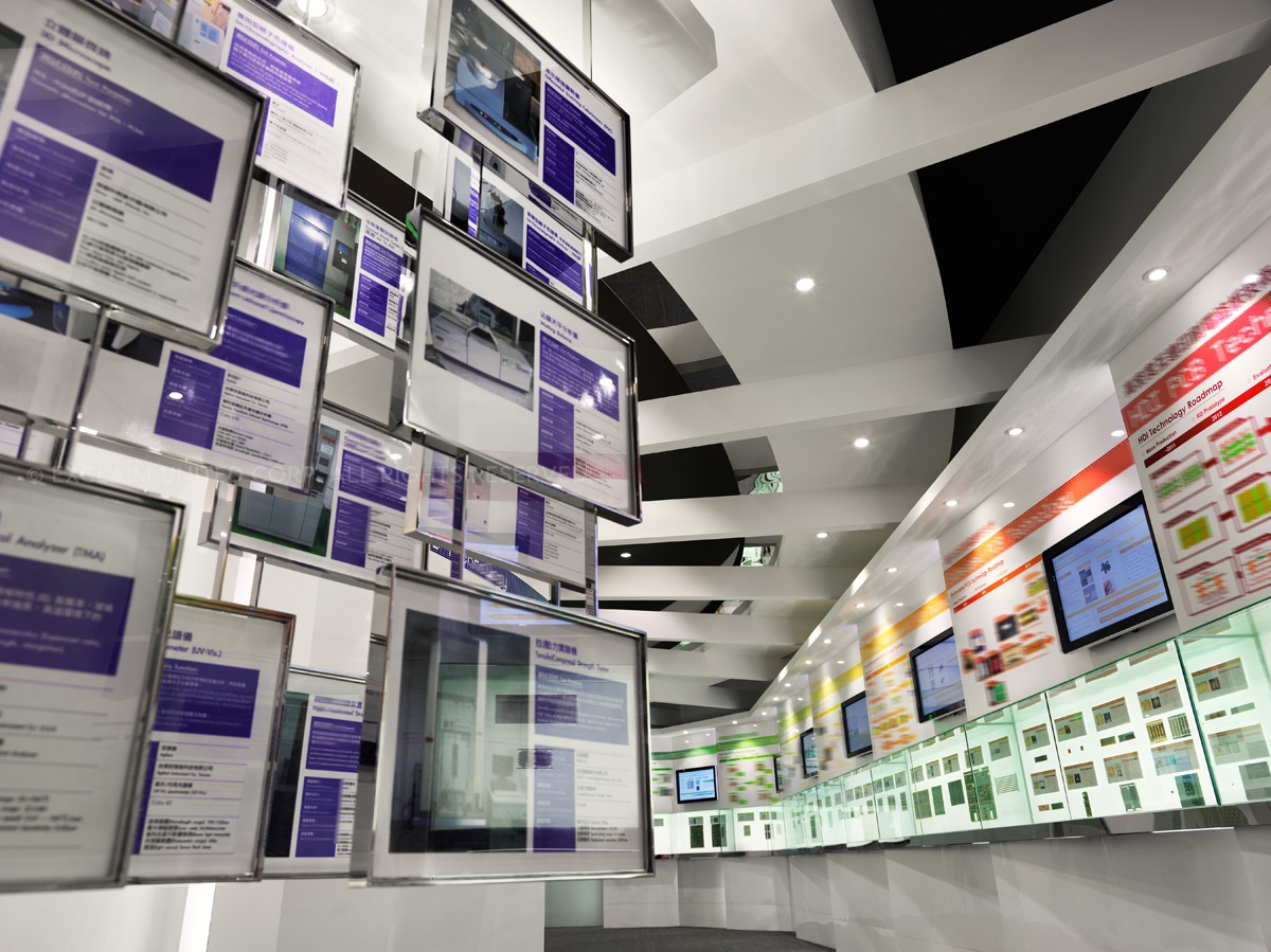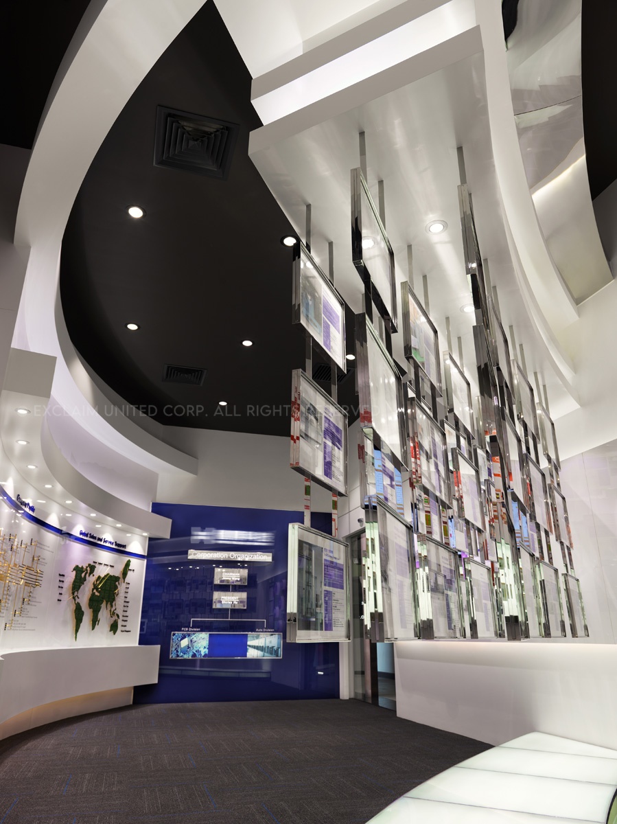 於是設計團隊開始著手整理企業本身相關產品資料,前後耗時約莫一年,將原先類似獎牌排列的電子產品,於立面的表現上透過弧線、階梯、懸挑的概念方式,將公司產品視為精品展示,融入於空間設計呈現並思考易於換裝的陳列方法置入其中。各區產品歸納後,將各系列注入明確的色彩計劃提高識別性,跳脫傳統的生硬,為傳統電子產業定位產品專業度及深度,充分展現出企業亮眼的實力表現。以精品的意象藉由平面方式展開設計,並延伸出未來科技,同時利用實體與觸控界面的交互導覽,提供即時的互動式說明,圖文解說賦予每個專業技術自己的演繹力。讓客戶對於企業本身的技術,可以更深入的瞭解與認識。