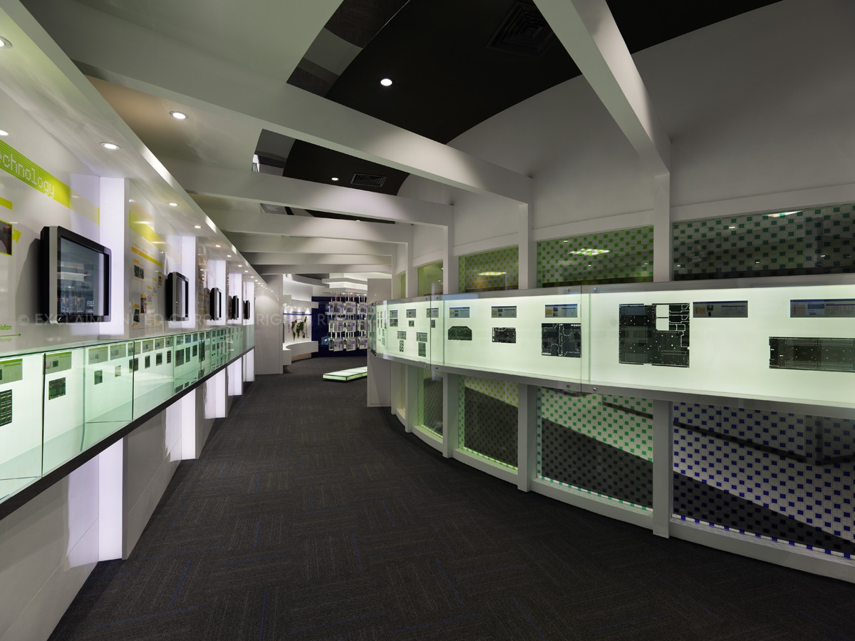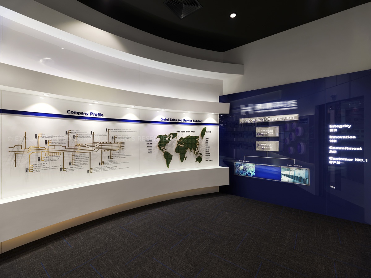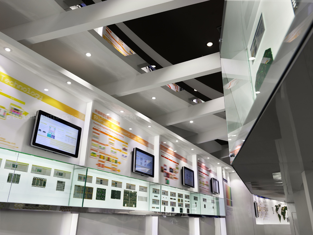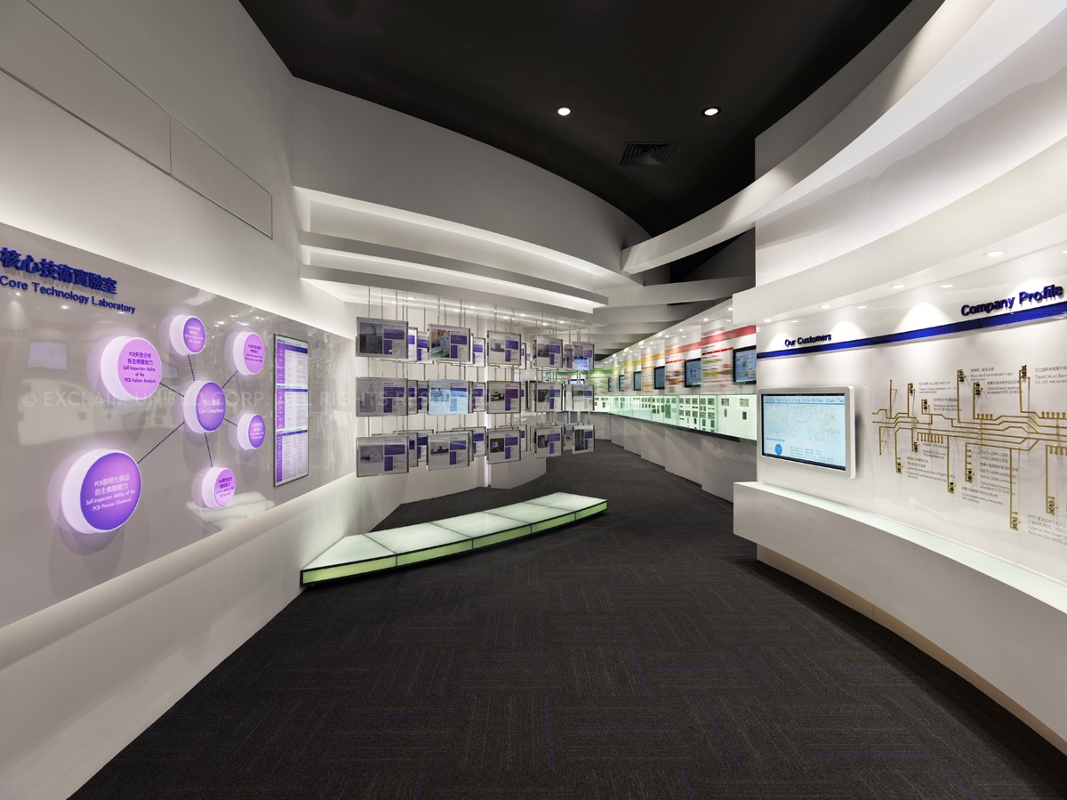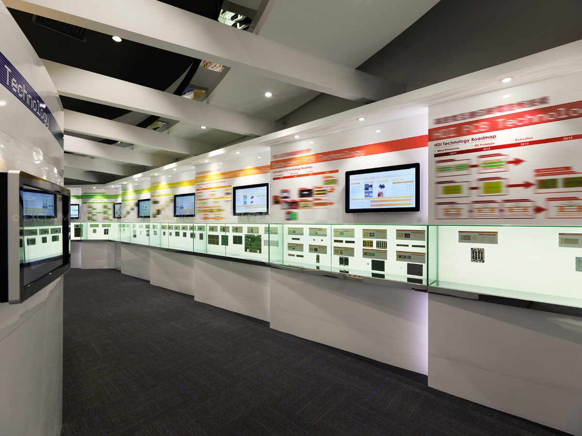 於是設計團隊開始著手整理企業本身相關產品資料,前後耗時約莫一年,將原先類似獎牌排列的電子產品,於立面的表現上透過弧線、階梯、懸挑的概念方式,將公司產品視為精品展示,融入於空間設計呈現並思考易於換裝的陳列方法置入其中。各區產品歸納後,將各系列注入明確的色彩計劃提高識別性,跳脫傳統的生硬,為傳統電子產業定位產品專業度及深度,充分展現出企業亮眼的實力表現。以精品的意象藉由平面方式展開設計,並延伸出未來科技,同時利用實體與觸控界面的交互導覽,提供即時的互動式說明,圖文解說賦予每個專業技術自己的演繹力。讓客戶對於企業本身的技術,可以更深入的瞭解與認識。