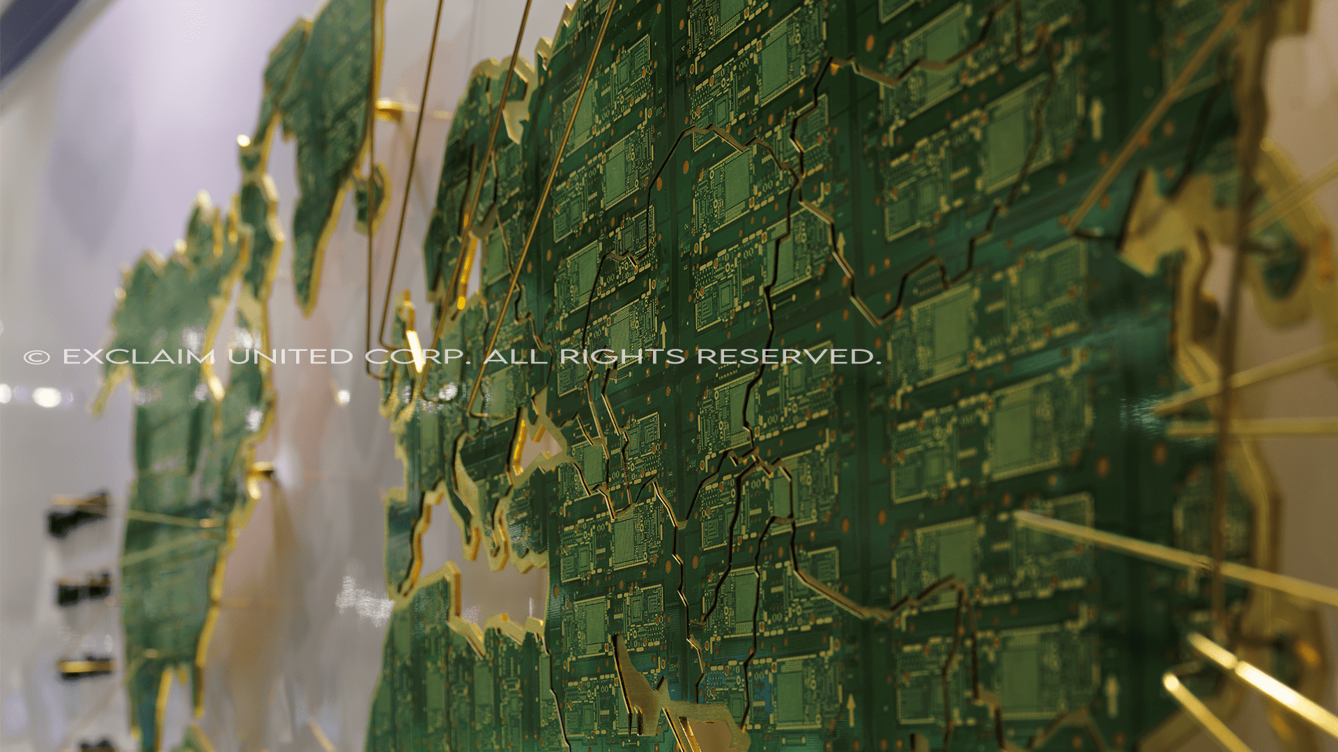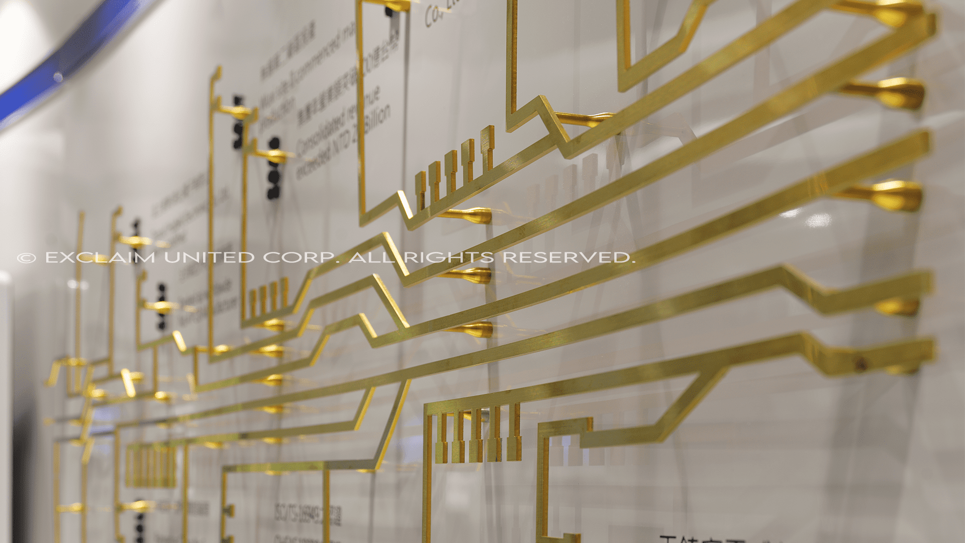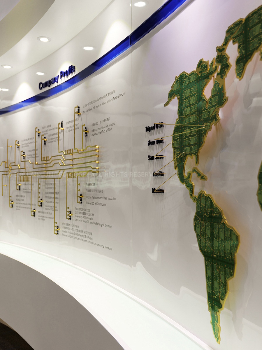 經由創意發想,將電子產品設計成展開式的全球地圖,說明企業本身在全球分布的經濟板塊,以及遠程目標的建立。設計團隊從企業本身的專業深度歸納、分析,衍生成為線面的圖騰符碼,在展示廳中呈現企業的獨特氣質與專業背景。
