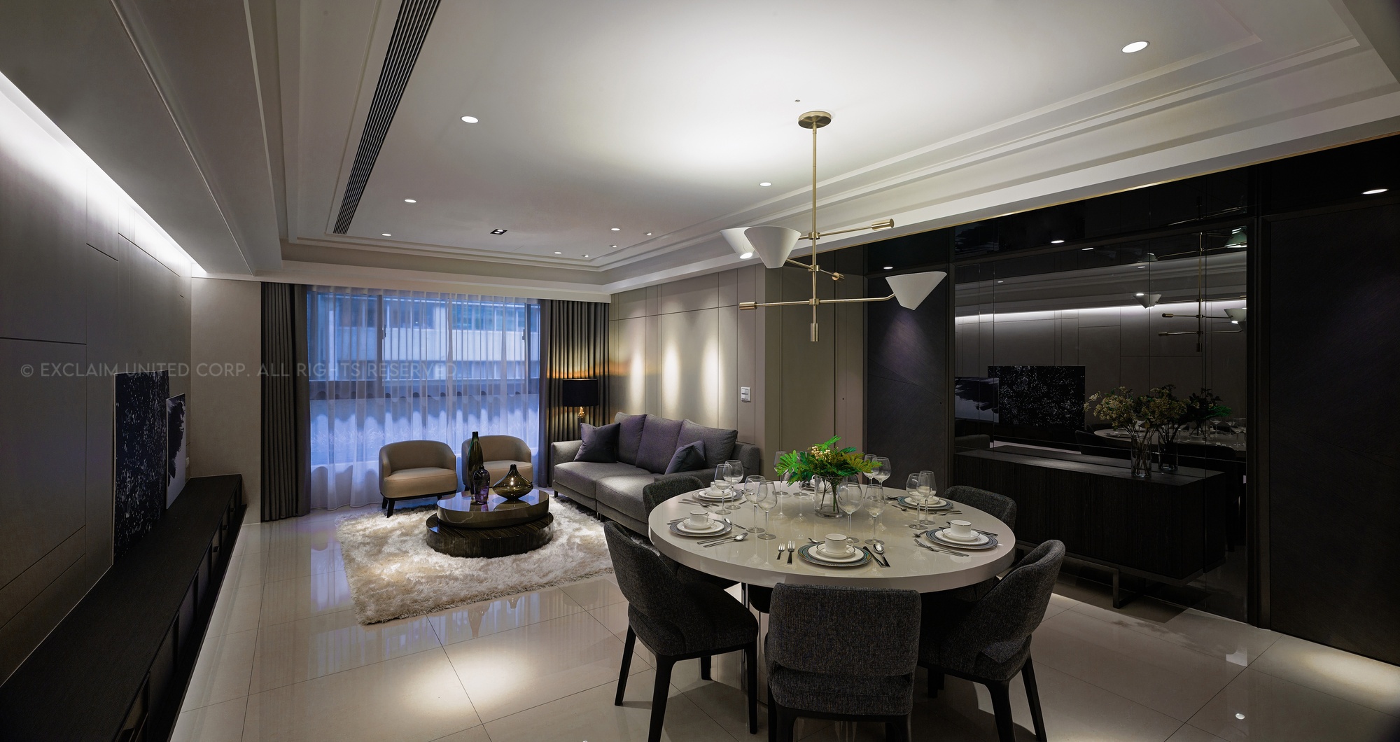 針對金融業菁英、事業有成的屋主,締造優越且品味的生活態度,將設計只軸定位在「簡約與時尚」、「內斂而雅緻」的設計調性,並發揮空間潛能,利用敞朗尺度與俐落的線面關係,形塑別具風格的時尚宅邸,並表現在公共場域的主牆與線面之上,演繹現代人對生活質素、時尚品味的嚮往。