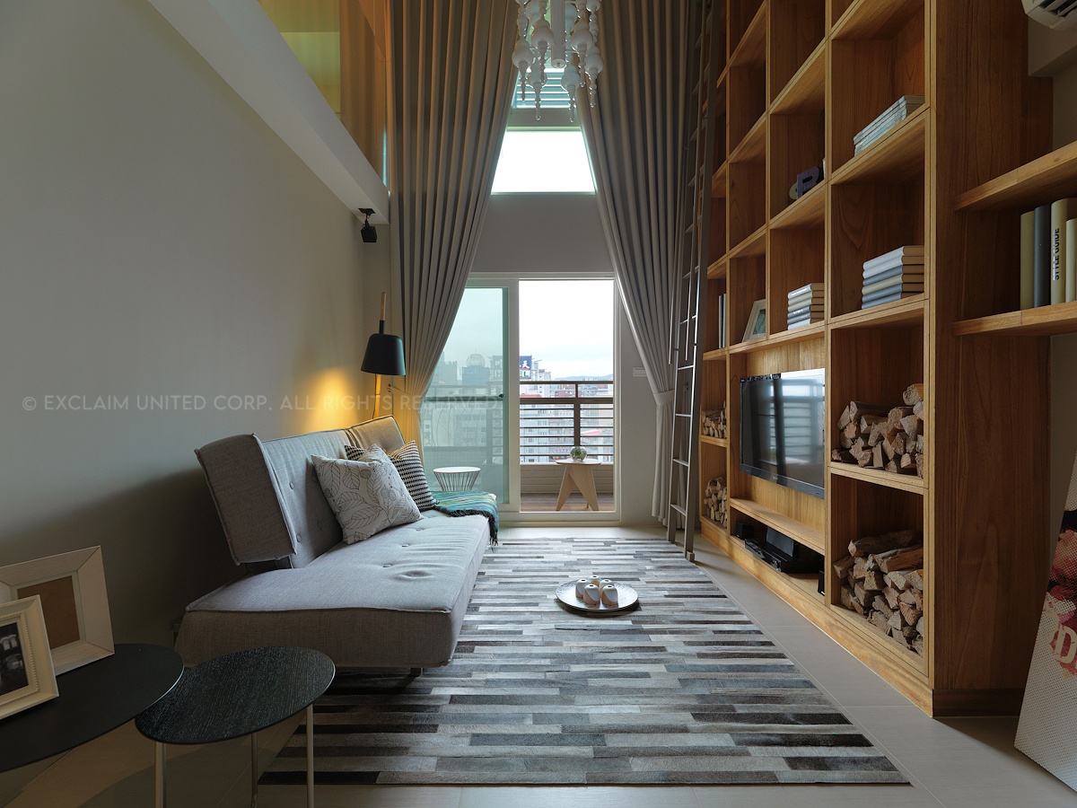 視覺落地原木書櫃,垂直的空間動線分配不同機能需求。